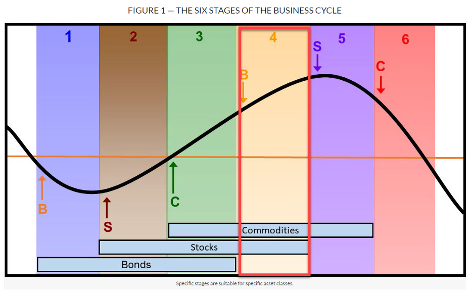At Pring Turner, and in the monthly Intermarket Review, we use these six turning points to define distinct stages of the cycle, much like the seasons of the year, each with its own investment implications. Our models currently place the cycle in Stage 4, an environment that is favorable for stocks and commodities while unfavorable for bonds and, notably, the most bullish stage of the cycle for commodity prices.