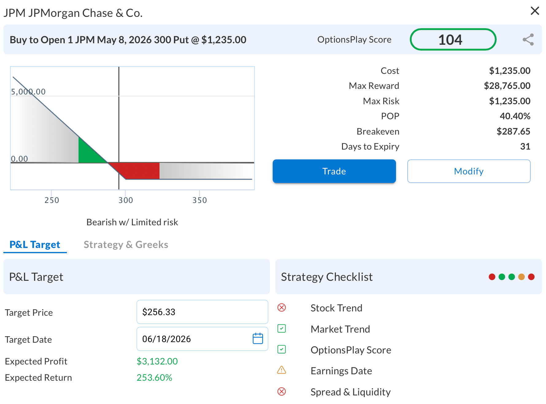 - A long put offers a direct way to express the bearish view, giving options traders a defined risk strategy with potential upside if JPM breaks down.