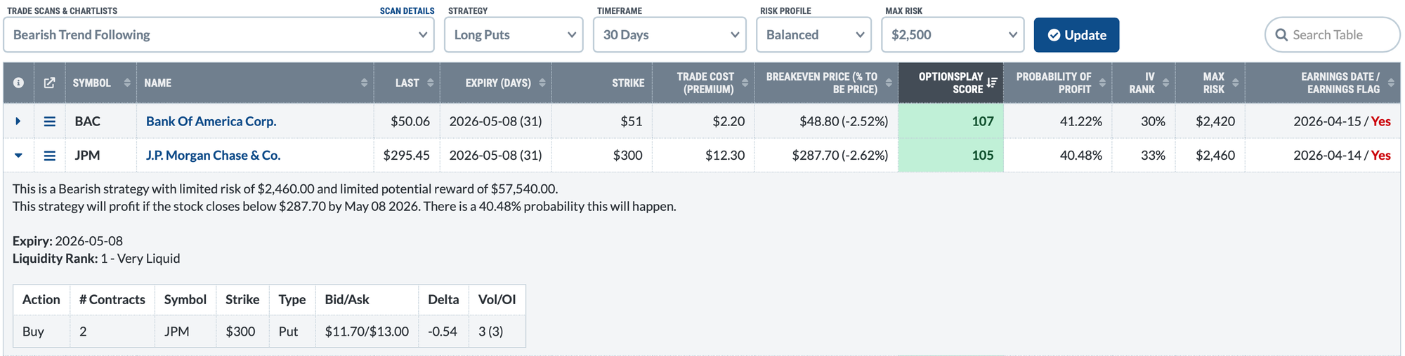 - OptionsPlay Strategy Center → "Bearish Trend Following" scan