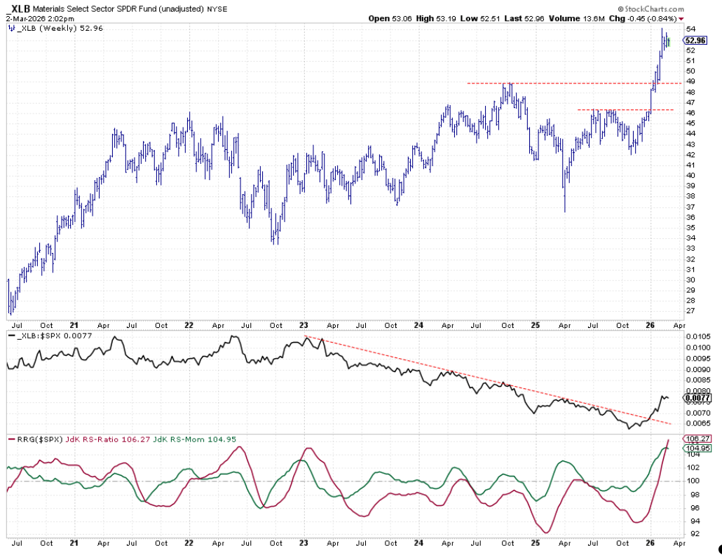 - Energy and Materials maintain strong relative uptrends.