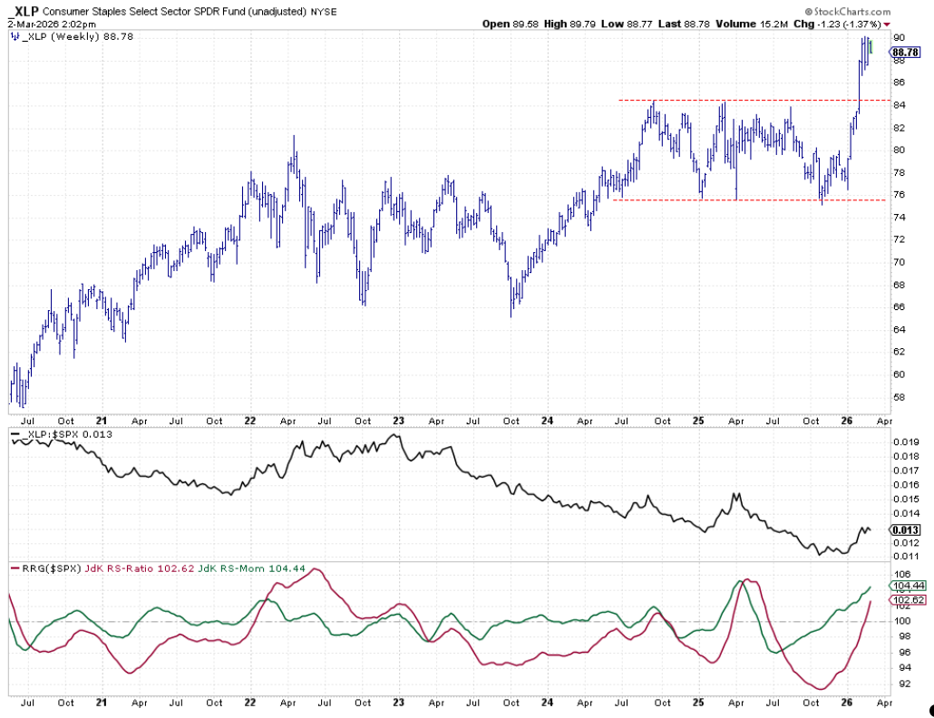 Consumer Staples show a similar pattern, consolidating around $88–$88.50 after a breakout five weeks ago. There is some room for a minor setback without damaging the positive trend. The RS line continues to rise, though a higher low would further confirm the uptrend.