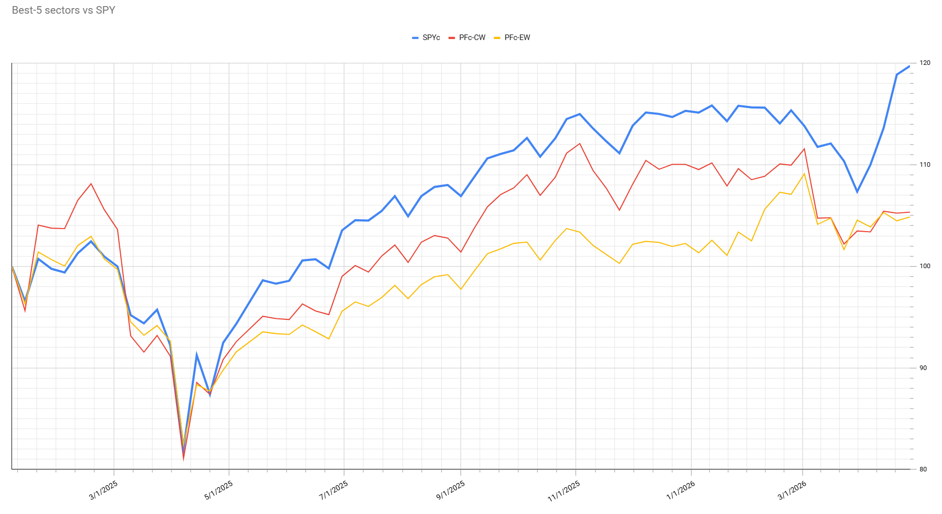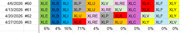 As I continue to research these strategies, I’ve noticed that sector moves, like Technology entering the top five, quite regularly happen midweek, causing the portfolio to miss out on performance for a few days. For example, Technology moved into the top five on April 22nd, but the portfolio only updates weekly, potentially missing strong moves.