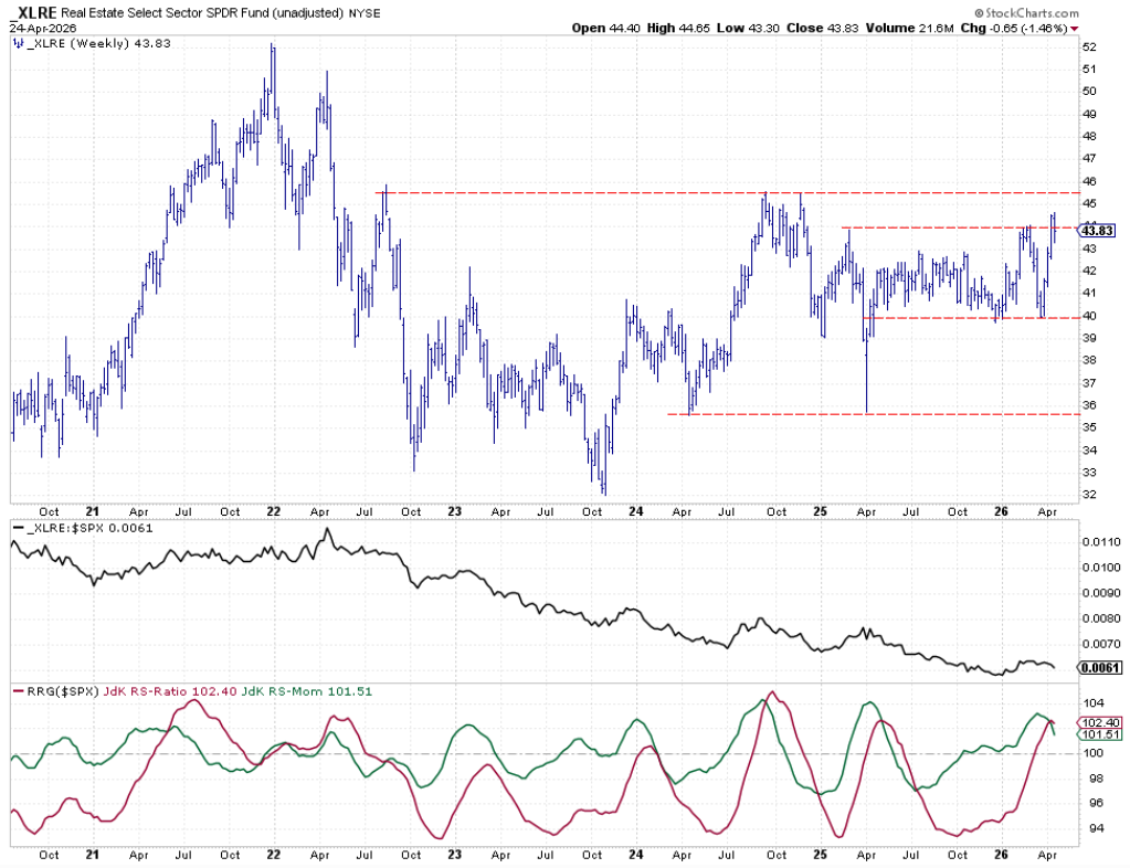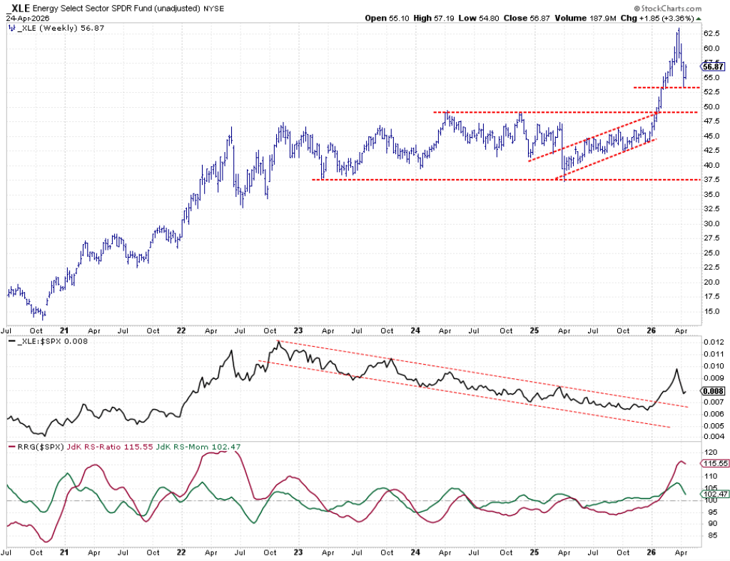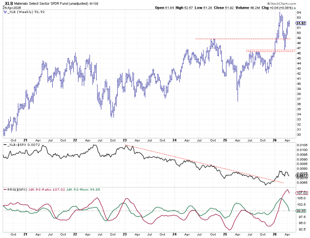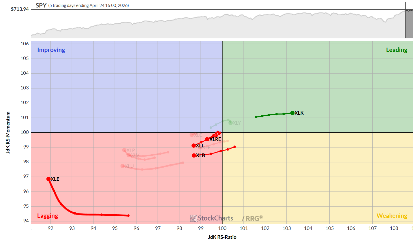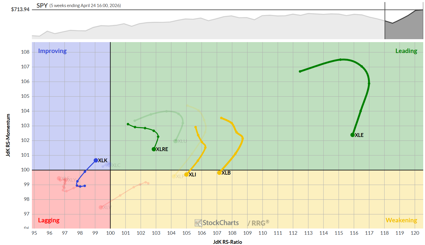 Looking at the weekly Relative Rotation Graph (RRG), the four static sectors in the top five—Energy, Materials, Industrials, and Real Estate—continue their established trajectories. Energy and Real Estate remain in the leading quadrant but are rolling over with a negative RRG heading. Materials and Industrials have crossed into the weakening quadrant, though all four sectors still show relatively high RS-ratio readings and continue to have potential to perform well.