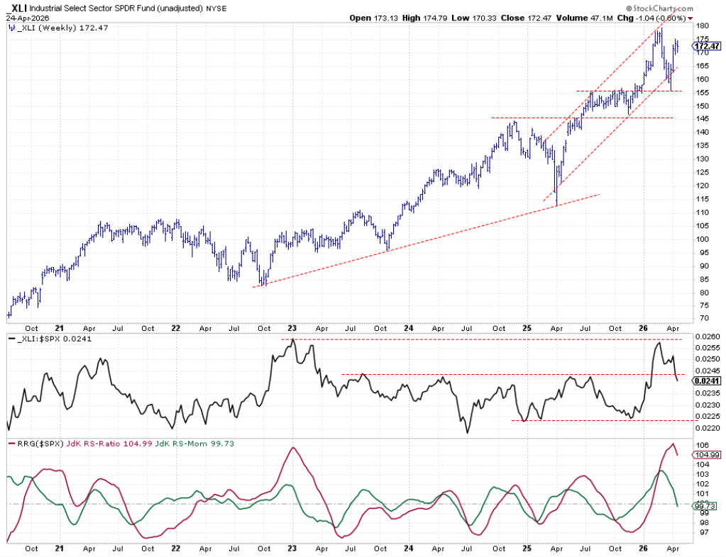 Industrials remain within their rising trend channel, but the relative strength line shows a clear lower-high, lower-low pattern, breaking below horizontal support. This could accelerate the sector’s downward rotation, and it’s uncertain whether it will stop before the RS ratio falls below 100. Industrials are in the weakening quadrant but still have room to recover if momentum returns soon.
