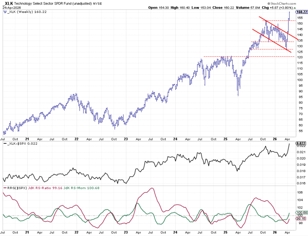 Technology is the standout sector. The price chart shows a rapid rally from roughly 130 to over 155 over three weeks, pushing the relative strength line above its previous high. Both RRG lines have turned upward, and technology is close to crossing into the leading quadrant on the weekly RRG, solidifying its place in the top five.