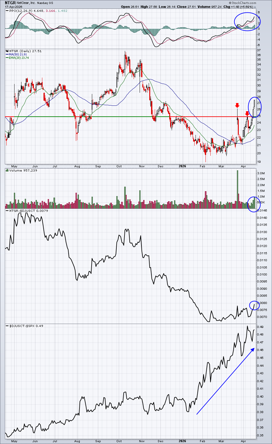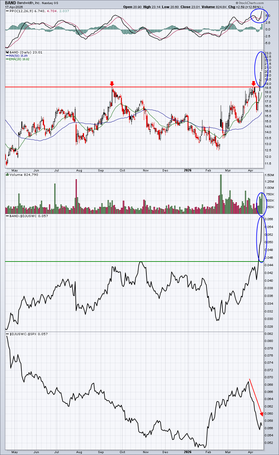 Earlier this week, in one of our Daily Market Reports to members, I indicated the absolute and relative strength in two smaller stocks, Bandwidth (BAND) and Netgear (NTGR). First of all, small-cap stocks continue to perform very well on a relative basis, but, if you can find individual stocks just making key breakouts, significant gains can be realized. Check out BAND and NTGR.