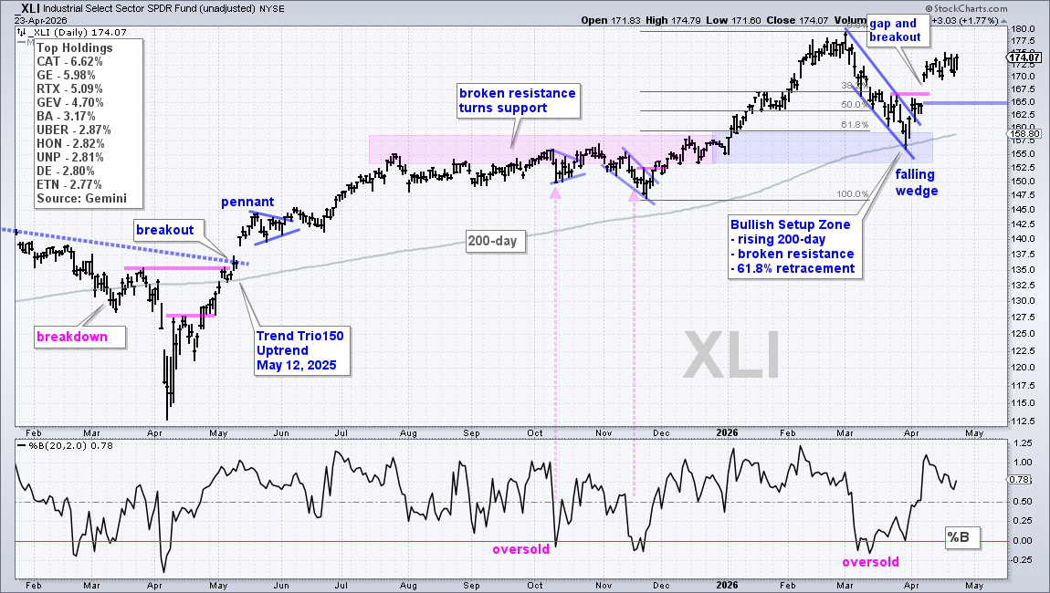 Our key trend indicator, the Trend Trio150, remained bullish throughout March for XLI and XLB. The table below shows Trend Trio150 signals for the 11 sector SPDRs. XLI and XLB signaled uptrends in May 2025 and December 2025, respectively (blue outlines). This signal table is free and updated every Saturday at TrendInvestorPro.