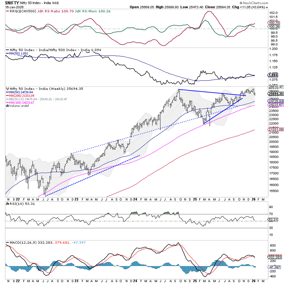 The truncated week (there was a trading holiday on Thursday due to the municipal elections in Mumbai) saw the markets largely consolidating in a narrow range, with Nifty ending the week almost flat with a marginal positive bias. The benchmark index witnessed low participation and remained range-bound throughout, given the lack of any major triggers. Nifty oscillated within a tight band of 426.40 points, marking an intra-week high of 25,899.80 and a low of 25,473.40. India VIX edged slightly higher by 4.10% to 11.37, indicating a marginal uptick in volatility expectations, although it remains within historically benign levels. Nifty closed the week with a minor gain of 11.05 points (+0.04%).