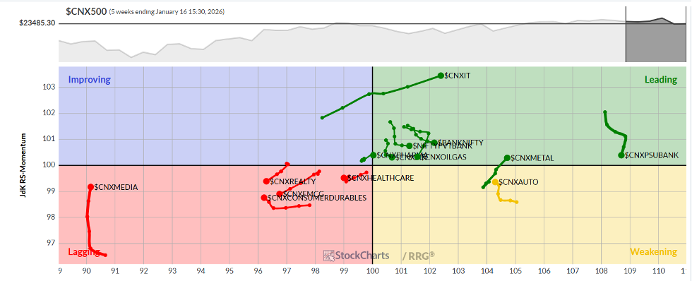 Important Note: RRG™ charts show the relative strength and momentum of a group of stocks. In the above chart, they show relative performance against NIFTY500 Index (Broader Markets) and should not be used directly as buy or sell signals.