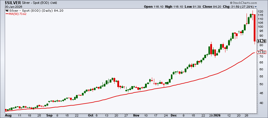 If you look at the Silver futures below, Friday’s action really jumps off the screen. In one day, silver erased nearly all of January’s gains, plunging about 30% before reversing. Despite the massive selloff, silver stayed above its 50-day Simple Moving Average (SMA), a level many investors watch closely.