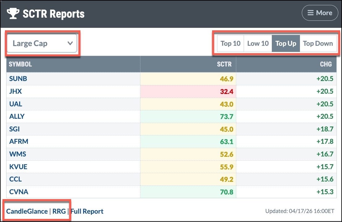 So, which stocks should you be considering? When the market moves up this quickly and the large-cap growth stocks have already surged, it can feel like you’ve missed out on the move. But not all stocks have fully recovered pre-war losses. One way to spot those that still have room to run is to view the SCTR Reports panel on your Dashboard.