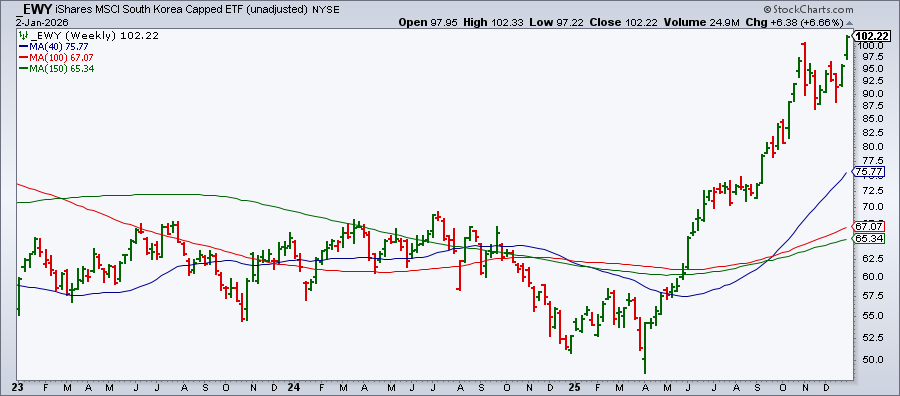 Click on South Korea, and you’ll pull up the iShares MSCI South Korea Capped ETF (EWY) chart, which is trading at an all-time high (see below). On the unadjusted weekly chart of EWY, you can see the ETF has been climbing aggressively since mid-2025.