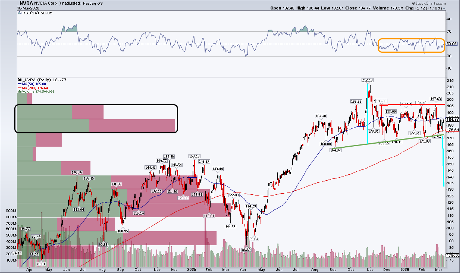 My take? Wait for a close below $170 before getting too bearish on the $4.4 trillion market cap company. The most dire scenario could be a breakdown below the aforementioned support line, triggering a major head-and-shoulders top. The measured-move price target would be $130–$135, based on the $212 head and the low-$170s neckline (annotated in blue in the above NVDA chart).