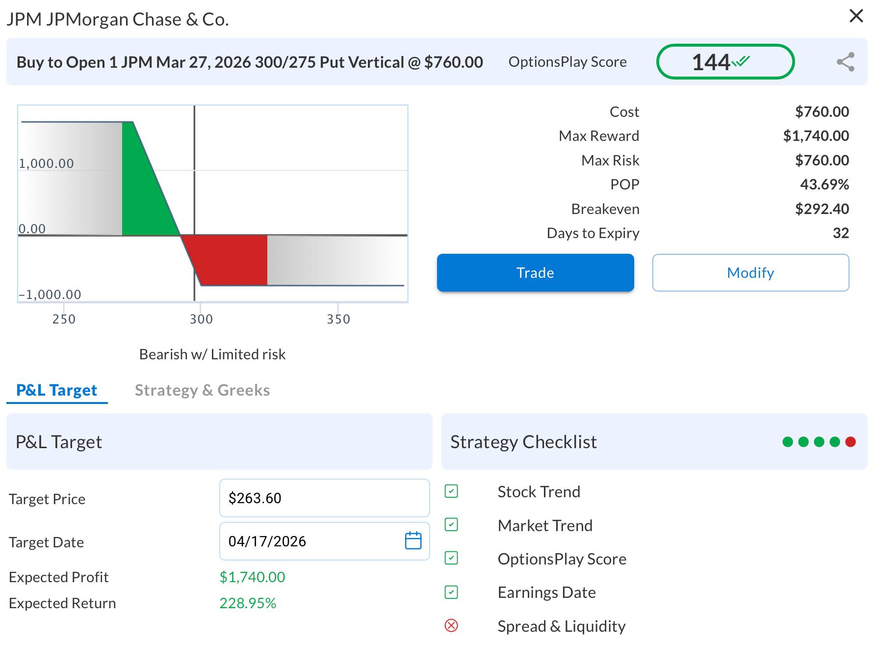 This is where the opportunity gets interesting. OptionsPlay's Bearish Trend Following scan, designed to surface stocks showing sustained technical weakness, flagged JPM with an OptionsPlay Score of 144 and highlighted a Bear Put Spread as one of the most compelling risk/reward structures available.