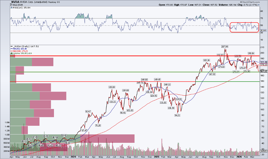 Take a look at the RSI momentum oscillator at the top of the chart, which has ranged in a bearish zone between 30 and 60 since November as price consolidated below $200. This is yet another “distribution” pattern, in which there is a lot of churning (and no upside action). The presumption is that large traders are gradually unloading shares. The good news is that a solid congestion zone lies just below the current price, beginning at $149 (the range highs from late 2024 and early 2025).