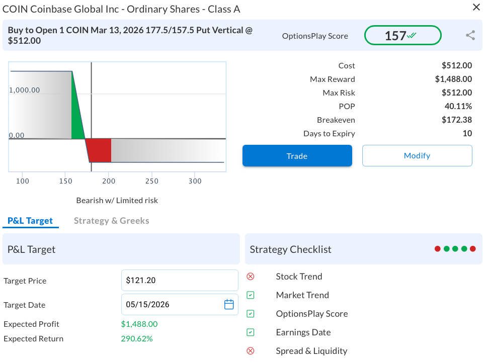 Using the OptionsPlay integration, we identified an aggressive Bear Put Spread designed to take advantage of this immediate weakness.