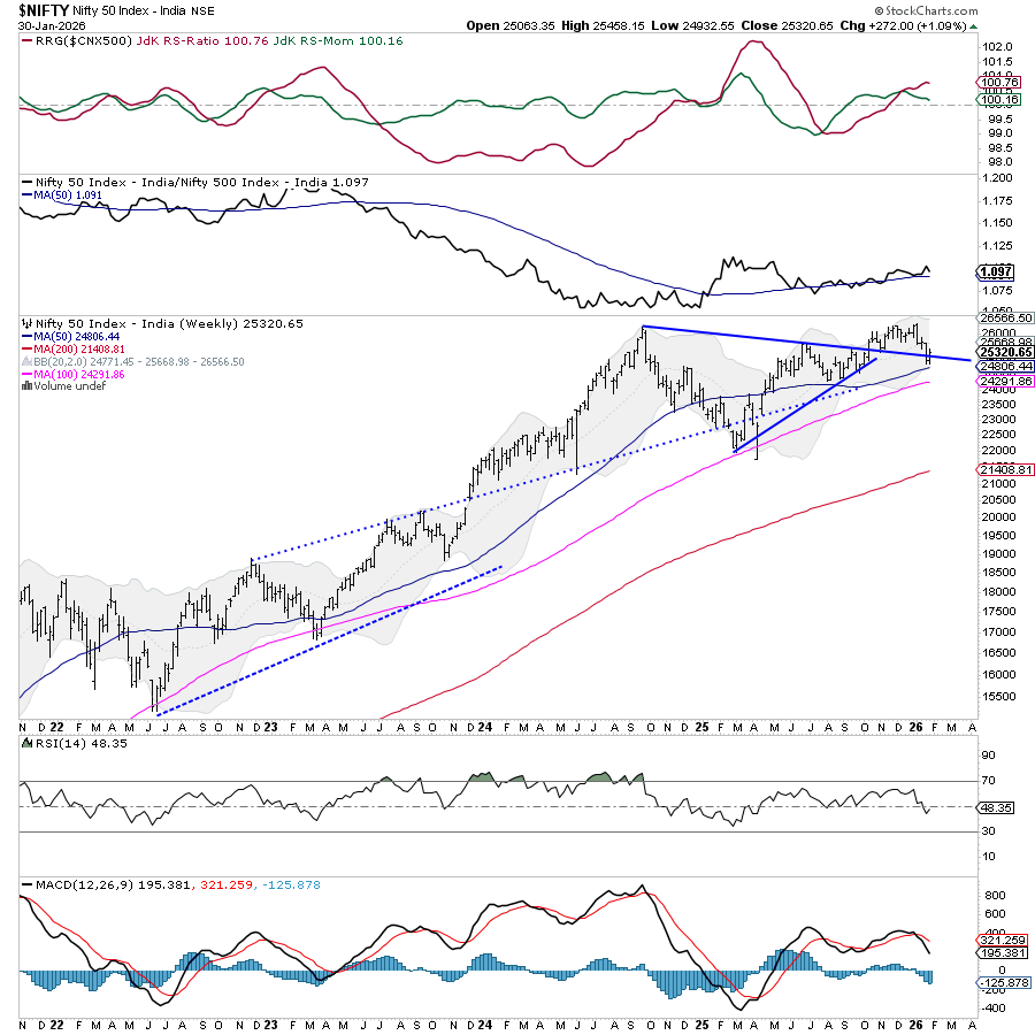 A key domestic event, the Union Budget, is scheduled for Sunday. Markets have a full session on Sunday. Nifty continues to trade within a broad consolidation zone and has managed to defend its 50-week MA (24,806); it has also defended the 200-day MA (25,199) after slipping below it in the previous week. The Index can be observed taking support near the downward falling trendline and has closed slightly above this critical zone. Markets are currently not in a trending phase, and a decisive break above 25,400 or below 24,900 would be required to set a directional move. The trend remains vulnerable to headline risk from Budget announcements, which could trigger a breakout or breakdown depending on the proposals.