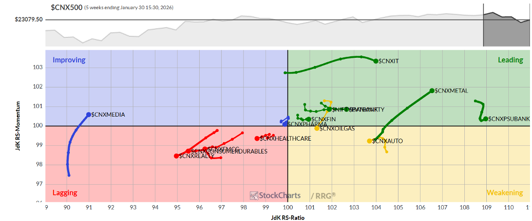 Relative Rotation Graphs (RRG) show the Nifty IT Index, Financial Services, Midcap 100, Metal, PSUBank, Banknifty, and Services Sector Indices placed inside the leading quadrant. While indices like Services and Midcap 100 are loosening their relative momentum, this group is likely to largely outperform the broader markets relatively.
