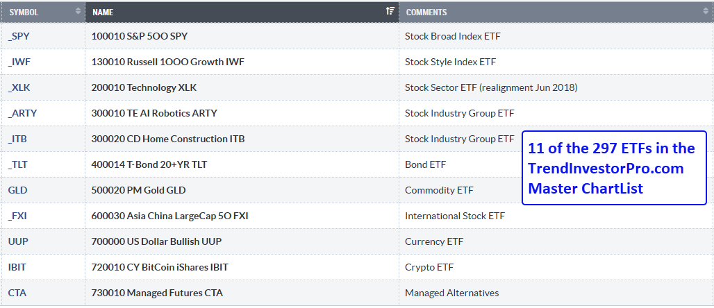 A robust analysis process starts with an organized and comprehensive ChartList. This is where we run scans, view performance tables, browse CandleGlance charts and perform detailed chart analysis. TrendInvestorPro subscribers get access to our Master ETF Chartlist, which has over 290 ETFs organized in a logical top-down manner. Sections include broad index ETFs, sectors, industry groups, bonds, commodities, crypto, currencies, and alternatives. Below is a screen shot showing some of the ETFs and groups covered.
