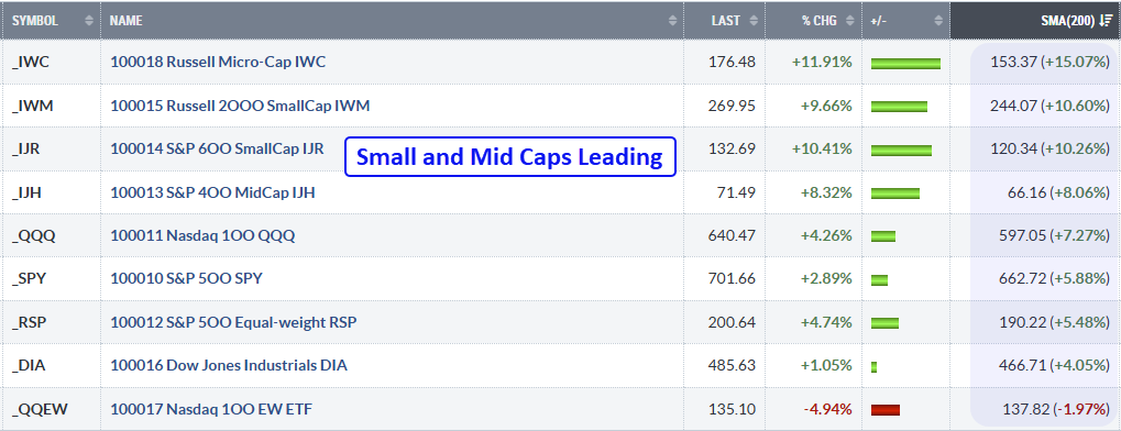 The summary table below shows performance for SPY, QQQ, and seven other major index ETFs. This table is sorted by the SMA(200) column, which shows the percentage above the 200-day SMA. The Russell Microcap ETF (IWC) is leading because it is 11.91% above its 200-day moving average. Small-caps are next, with the Russell 2000 ETF (IWM) and S&P SmallCap 600 SPDR (IJR) over 10% above their 200-day SMAs. SPY and QQQ, in contrast, are less than 5% above their 200-day SMAs.