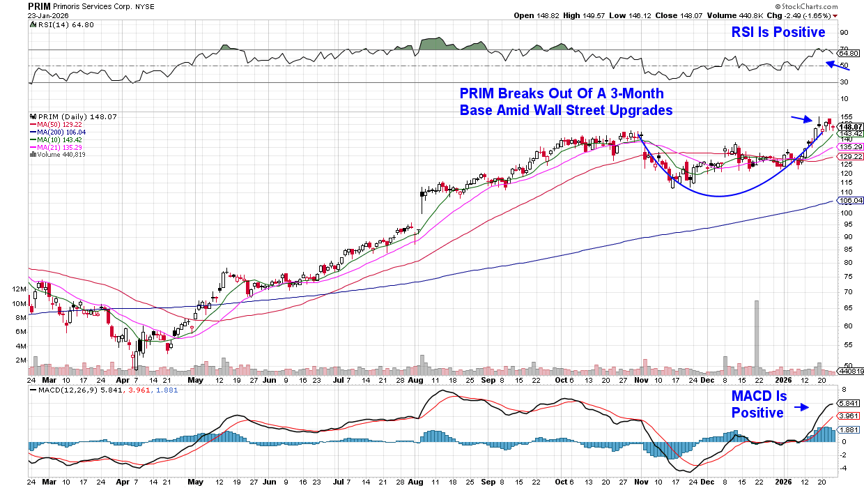 Below is a stock that is both a small-cap name and a real-asset-linked company, which has positive metrics. Primoris (PRIM) is a diversified infrastructure contractor with significant exposure to utility, energy, and civil markets, which are all seeing expansion.