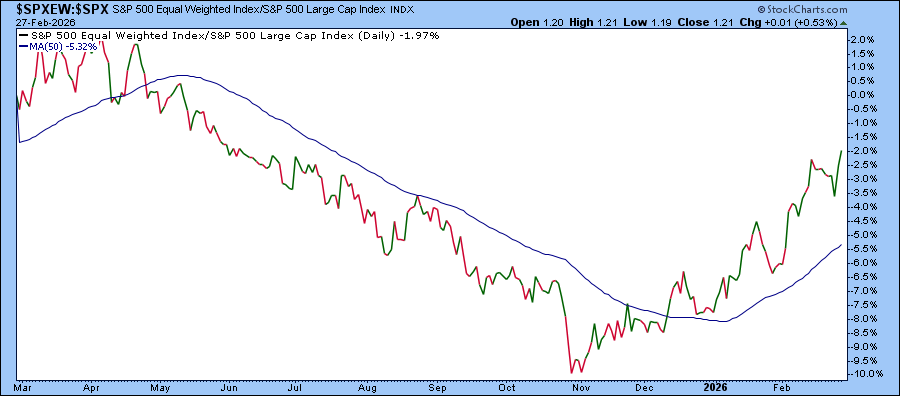 It’s not all bad news. The S&P 500 Equal-Weighted Index ($SPXEW) been gaining relative strength versus the cap-weighted S&P 500.