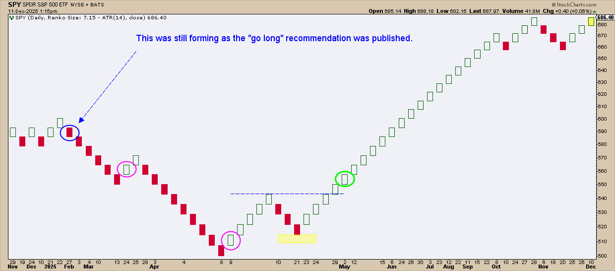 - Many might not have bought SPY on a down brick (see blue circle), waiting for at least one bullish reversal brick . That’s the most common Renko rule.