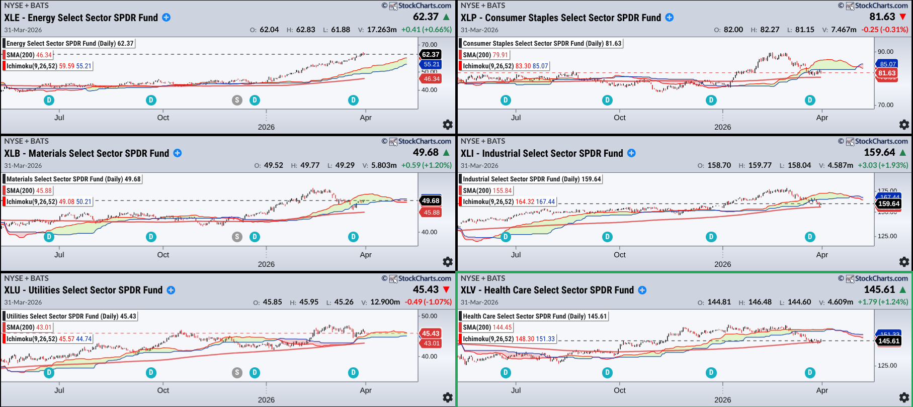 Here’s another example. Suppose a trader was looking for an entry point among the top six sectors. They pull up a chart of the top six, using a 200-day SMA and an Ichimoku Cloud to gauge trend momentum and support/resistance range.