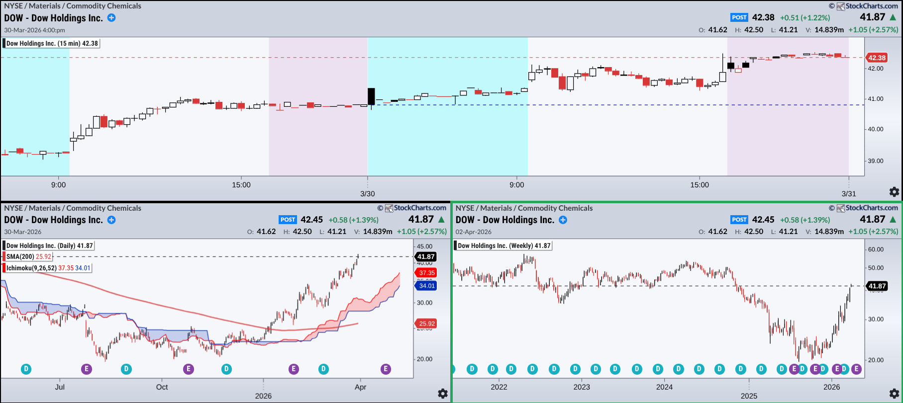 This simple setup is like a three-panel decision workspace. Suppose a trader was looking to enter a position in Dow Holdings Inc. (DOW). The 15-minute chart (top) is the fine-tuning panel. Price is compressing in a range, and the key question is simple: Does it break up or down?