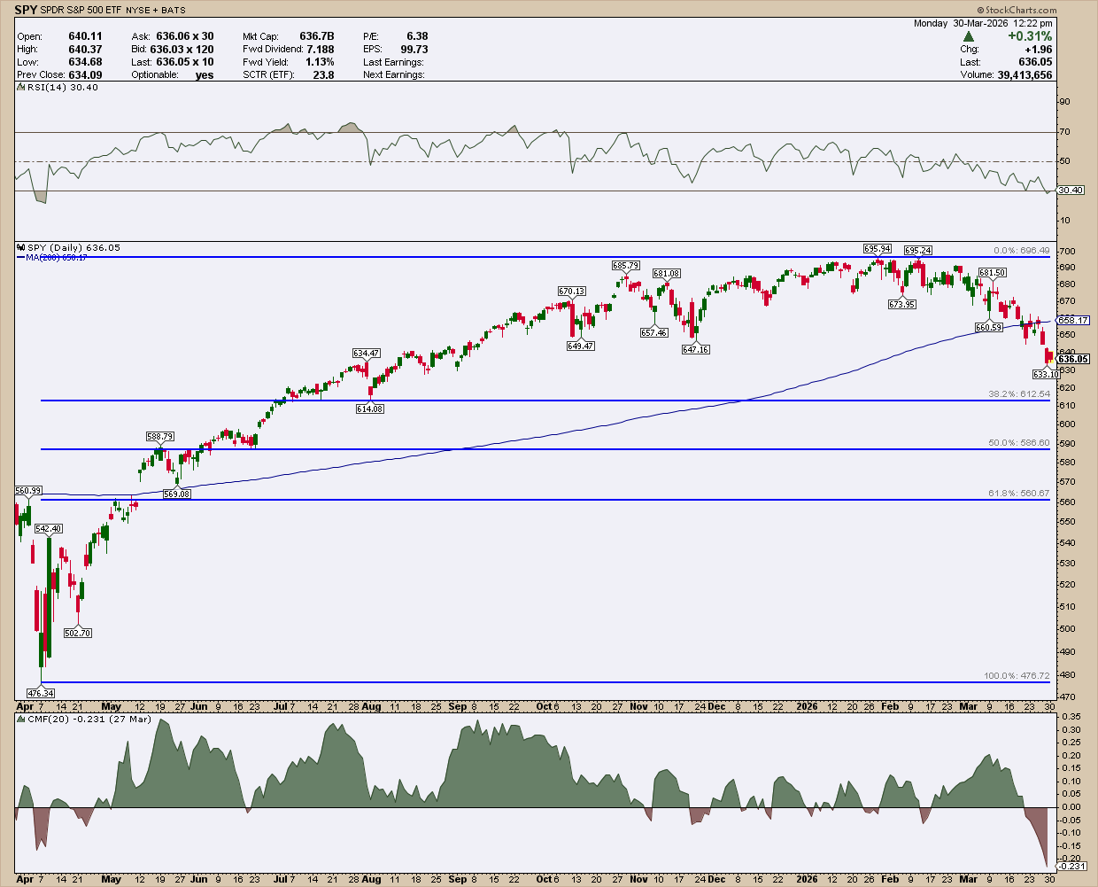 The chart below is just one of many settings. It’s pretty simple—I’ve got the Relative Strength Index (RSI) to measure momentum, the Chaikin Money Flow (CMF) to gauge buying/selling pressure, the 200-day simple moving average (SMA) to get a clearer picture on trend momentum, and a Fibonacci Retracement tool to anticipate where the SPDR S&P 500 ETF (SPY) is more likely to reverse if it keeps falling.