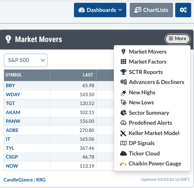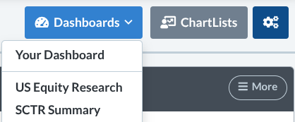 The Dashboard menu also offers specialized views such as Equity Research and SCTR dashboards, which provide different structural perspectives on the market.