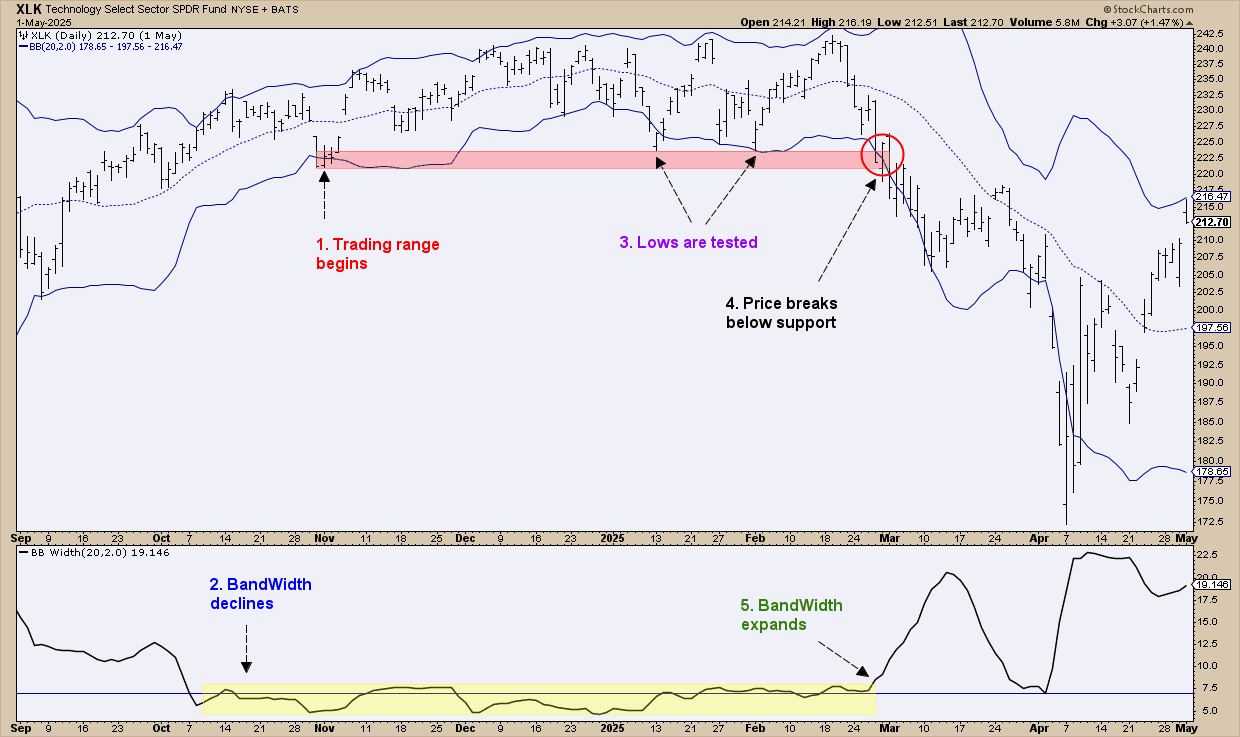 In late October to early November, the Technology Select Sector SPDR Fund (XLK) fell into a low volatility trading range. The BandWidth confirms that this is the start of XLK drifting in a limited range that goes on for around four months.