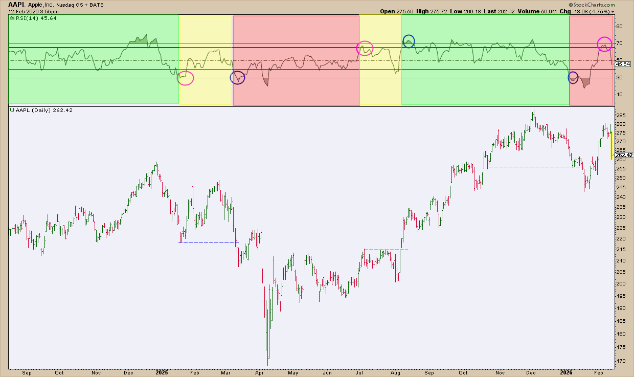 The takeaway: Instead of focusing only on overbought or oversold levels, watch how high and how low RSI travels. Strong stocks keep momentum elevated, while weak ones either struggle to lift RSI, or they keep downward pressure constant.