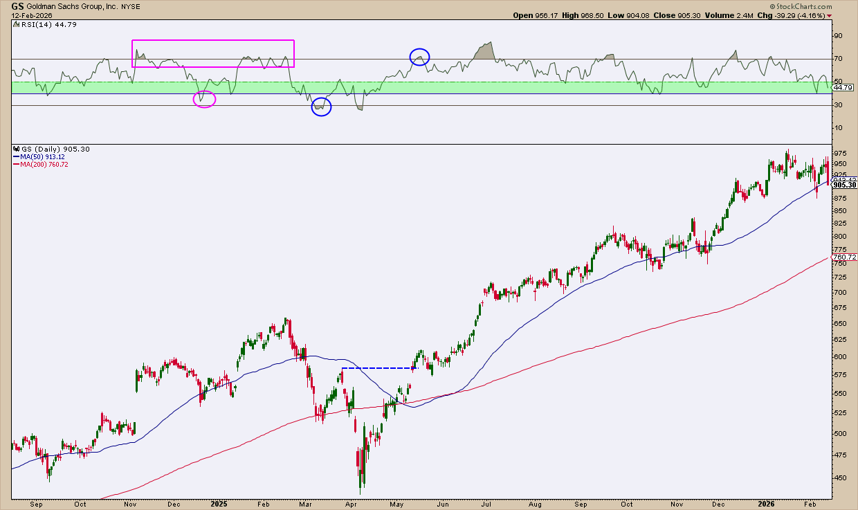 Looking only at RSI, momentum mostly stayed in a bullish range, telling us GS spent most of the last year and a half in an uptrend. A brief snag appeared when RSI slipped below 40 (magenta circle), but strength quickly returned as RSI repeatedly pushed above 70 (magenta rectangle).
