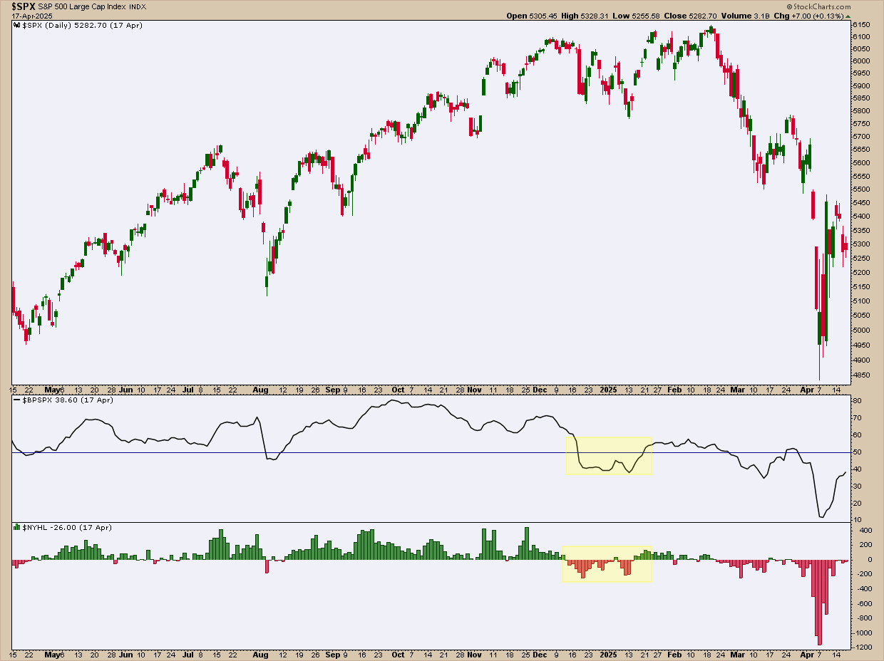 Now look at the shaded regions in the Bullish Percent Index (BPI) and Net New 52-week Highs:
