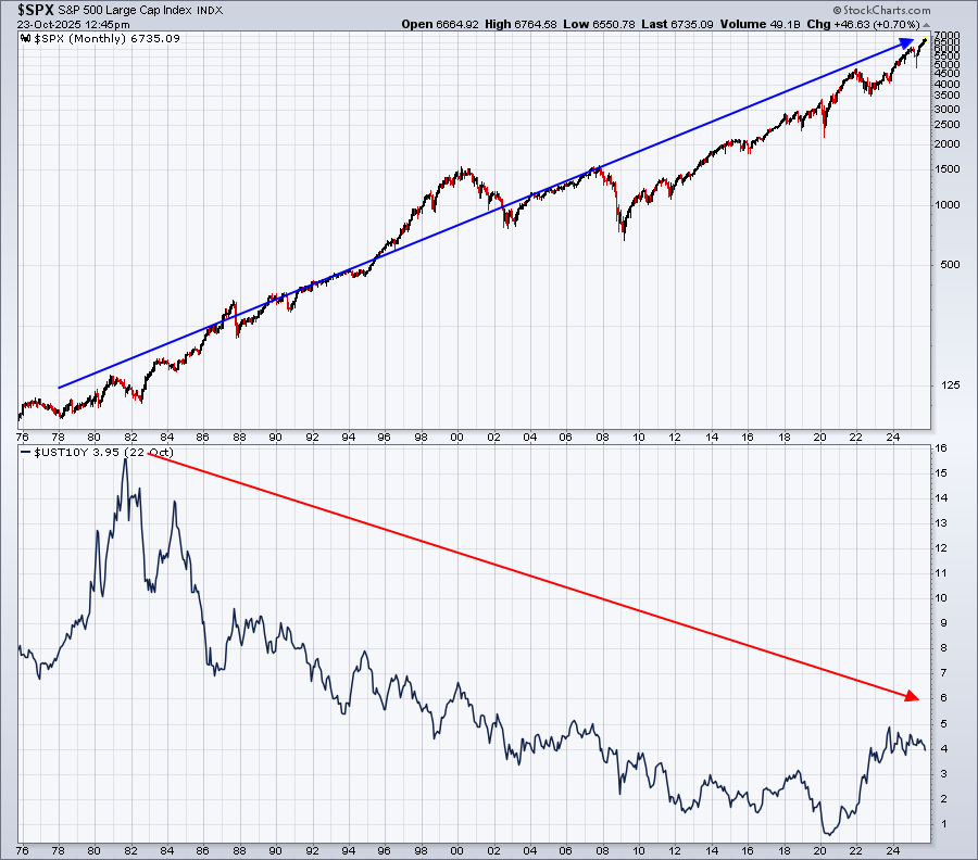 A "risk-free rate" is what I often used back in my public accounting days. This is usually defined as the return on long-term bonds. My preference was to use the 10-Year Treasury Yield ($UST10Y). As this long-term bond yield declines, we should expect market valuations to increase. One look at a long-term chart of the S&P 500 and $UST10Y will confirm this.