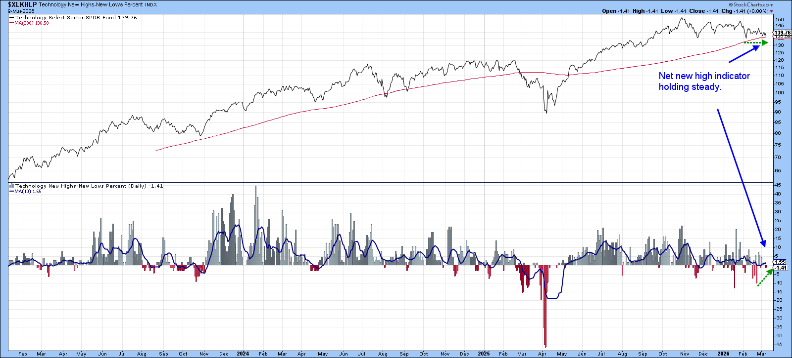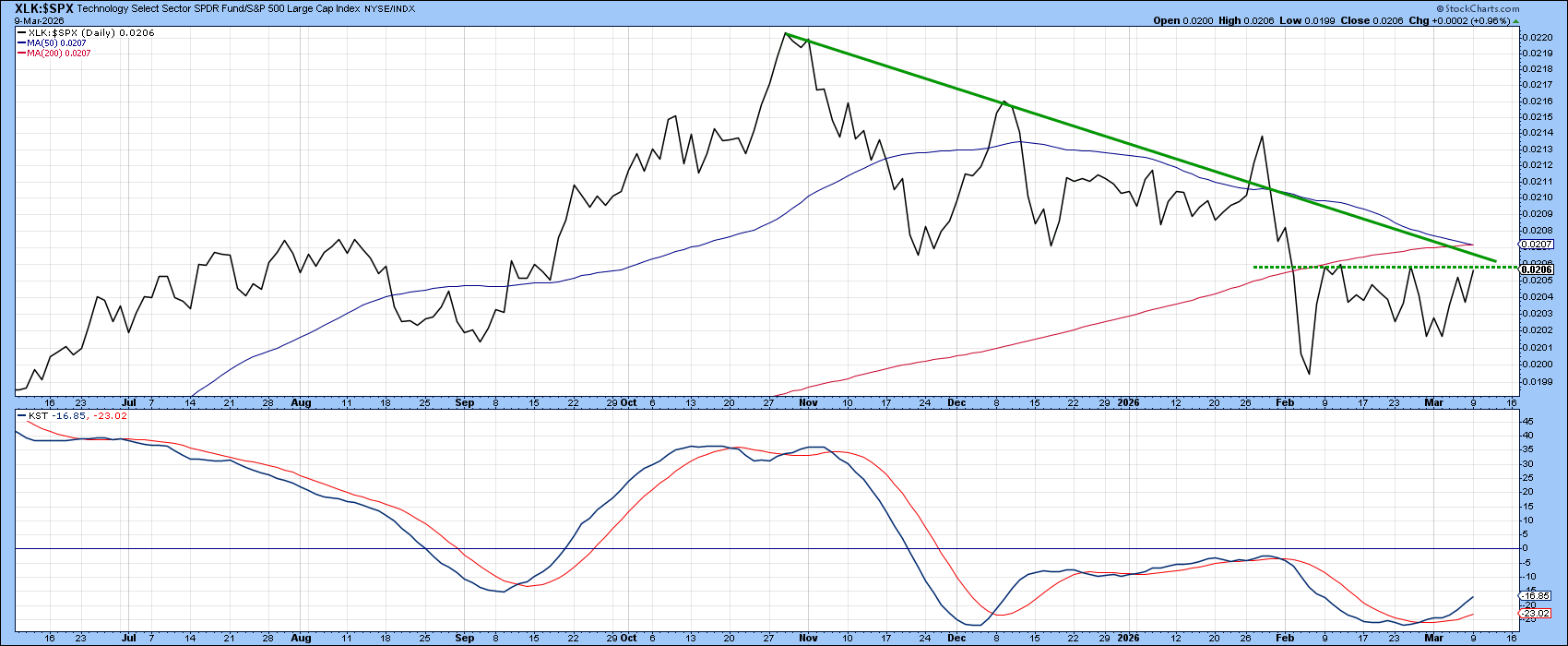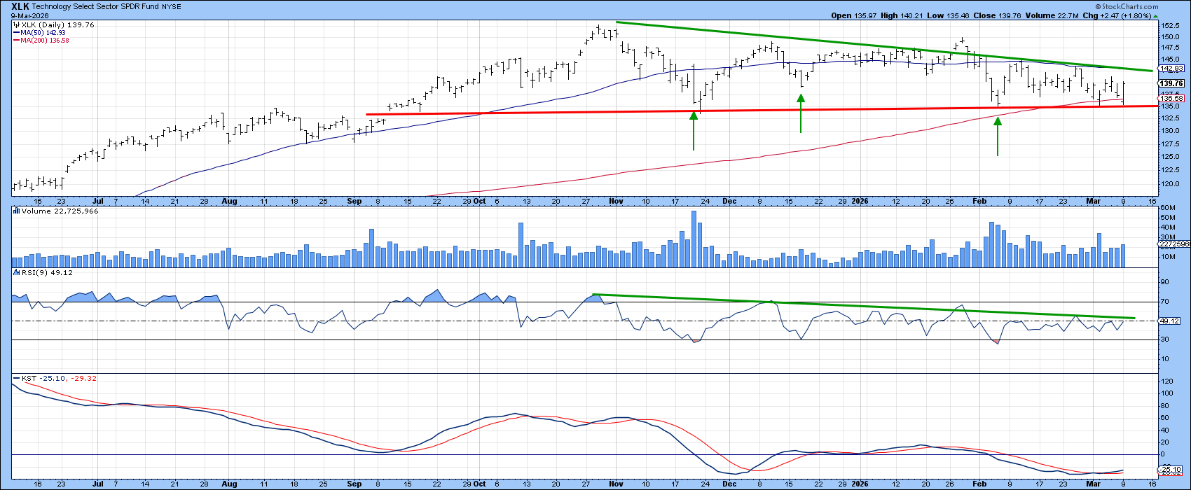 In Chart 1, the top two panels show that XLK’s price remains in a primary uptrend, trading above its 12‑month moving average and its long‑term secular trendline. The long-term KST is also positive.