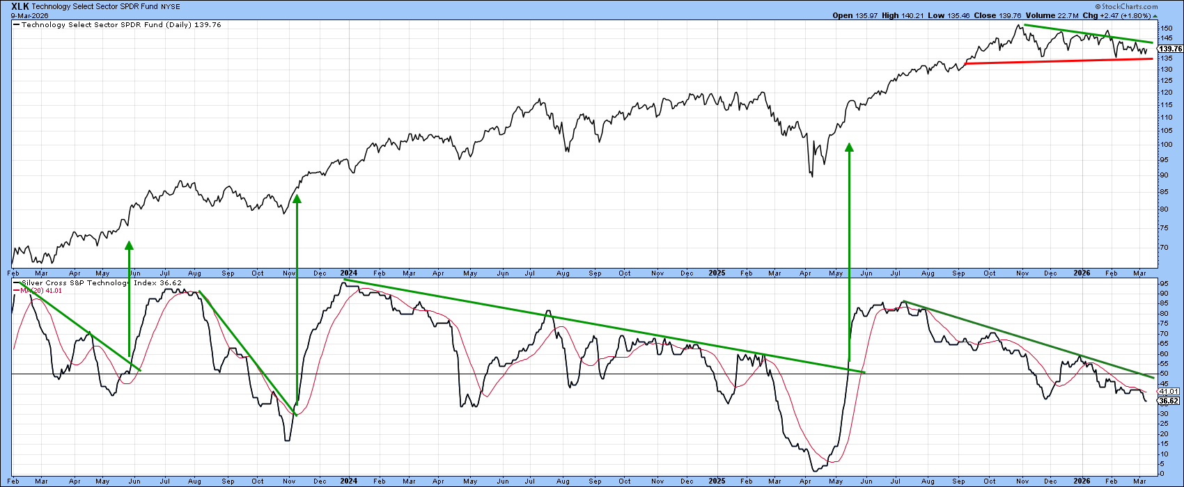 A review of StockCharts’ internal technology indicators shows that the sector is in an oversold intermediate condition and well‑positioned to signal a rally if a few key triggers fall into place. Chart 4 illustrates this by comparing XLK with the percentage of its components holding a positive Silver Cross. A Silver Cross occurs when a stock’s 20-day EMA moves above its 50-day EMA; each positive crossover adds to the indicator, while negative crossovers subtract from it.