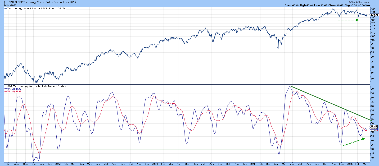 XLK dropped to the same level in February as it did last December. However, the bullish‑percent reading for technology stocks came in higher in February, indicating that fewer stocks were participating in the decline. That improvement in internal strength is a constructive sign.