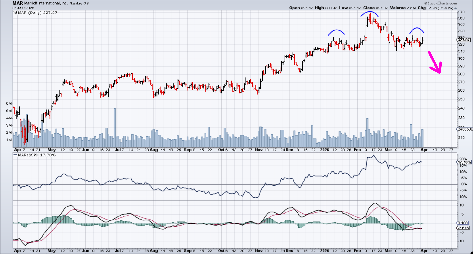 If MAR breaks below its neckline support, the measured move of this topping pattern points to a downside target near $285. The buyers are exhausted, and the trap is set.