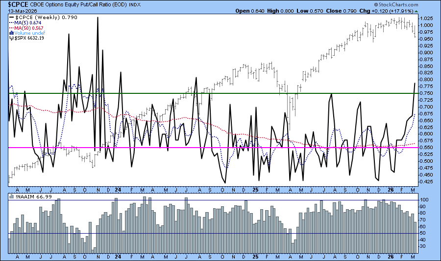 This is a good time to monitor sentiment indicators. The Cboe Volatility Index ($VIX) is trading between 20 and 30, which is elevated compared to calmer periods but not at the extreme levels we’ve seen during major market stress. Another sentiment indicator worth monitoring is the Cboe Options Equity Put/Call Ratio ($CPCE). The chart below shows the ratio is above 0.75 but is not yet at an extreme level. The last time the ratio went beyond 0.75 on the weekly chart was in late July/early August 2025, when the S&P 500 dipped below its 200-day moving average.