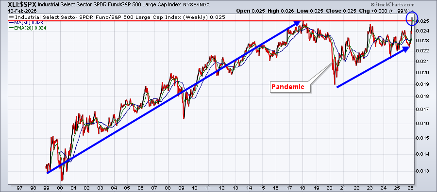 From 1999 through 2018, one sector consistently outperformed the S&P 500 over time, which was none other than the Industrials (XLI). Since 2018, however, Industrials struggled to make another relative breakout vs. the S&P 500 until 2026. Here's a chart that will provide a quick visual of Industrials' relative performance since the turn of the century.