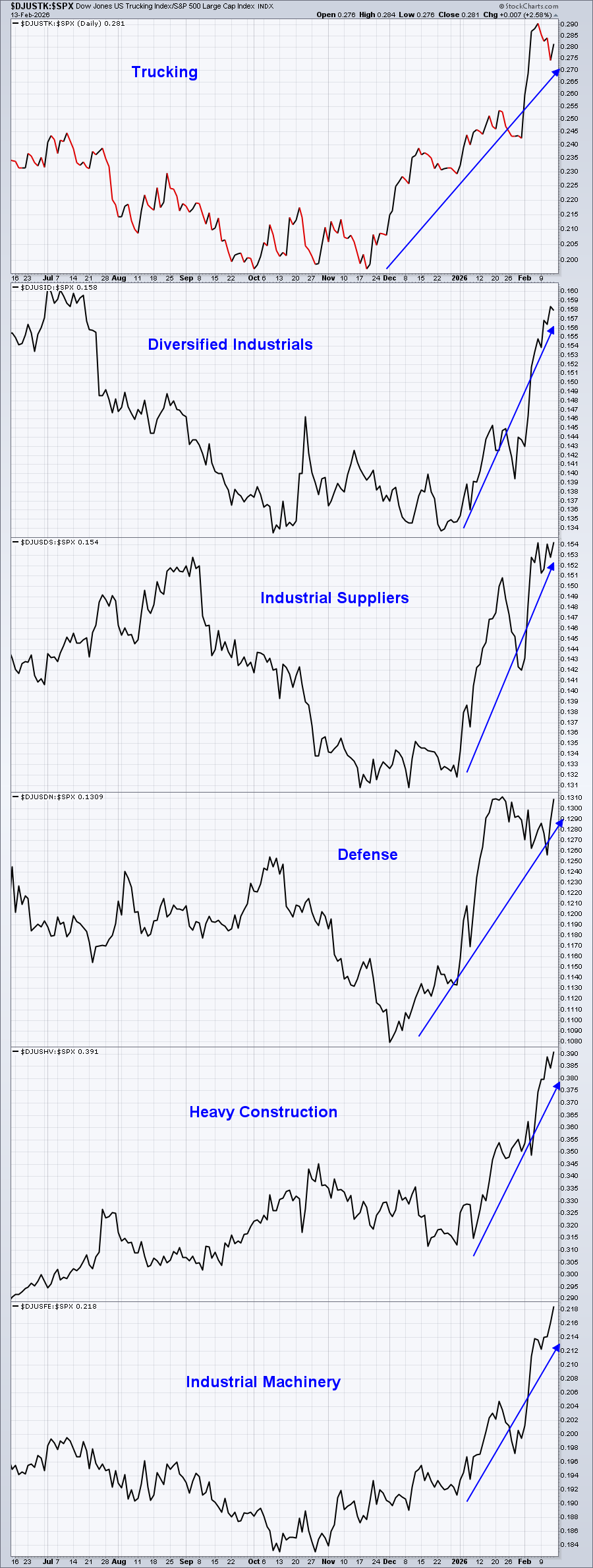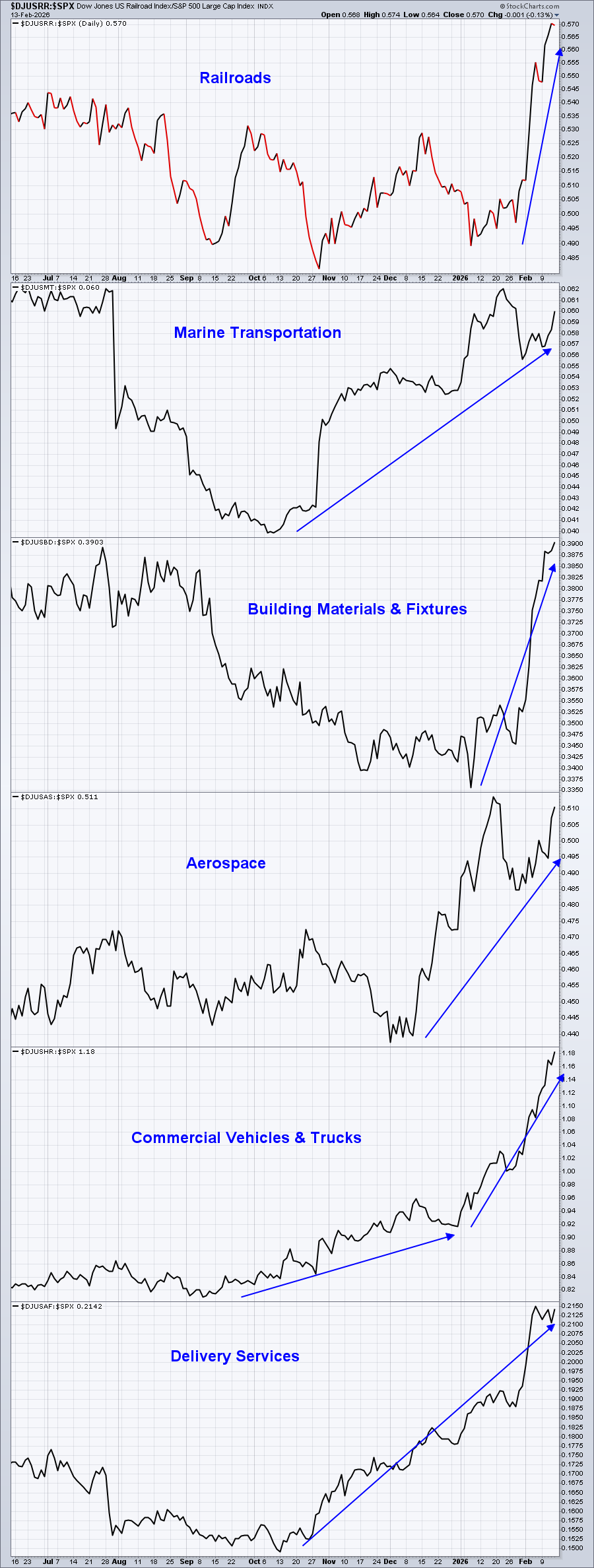 The strength in Industrials is across the board. Nearly every industry group within the sector is screaming higher right now. There are 16 industry groups in the Industrials sector. Below are the 12 strongest, in no particular order, relative to the S&P 500 (2 charts of 6 groups each are shown).