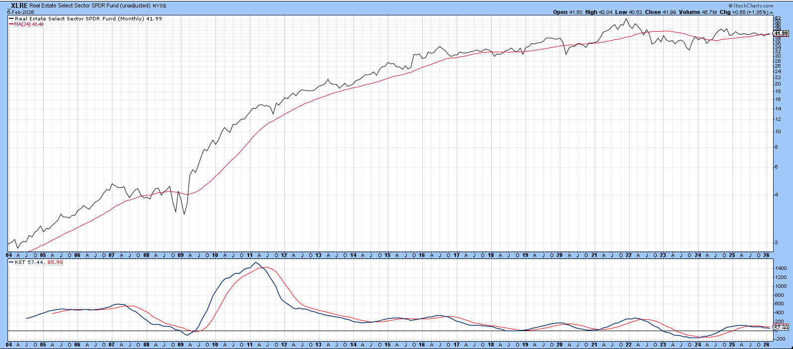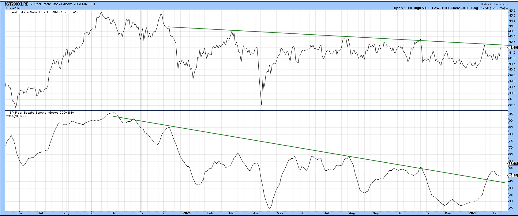StockCharts conveniently provides us with internal breadth indicators for the major sectors. One of these monitors the percentage of real estate stocks above their 200-day EMA, as displayed in Chart 4. Since the raw data is pretty jagged, the plotted series is a 10-day MA of the actual data, which peaked back in late 2024 and has been working its way lower ever since. In late January, it managed to decisively violate the 2024-2026 down trendline, which suggests the corrective period is over. The current, relatively subdued reading also leaves plenty of upside potential before the indicator reaches an overbought condition.