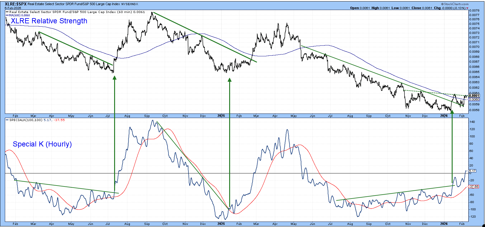 Even as the market has been soaring in the last two years, the XLRE has been moving sideways, thereby resulting in weak relative strength. Part of this underperformance, which actually began over 10 years ago on a pure price basis, is displayed in the upper window of Chart 5 using hourly data. The chart also features the Special K (SPK), which uses the exact same parameters as it would on a daily chart. Important signals of a reversal in trend are triggered when it is possible to construct a trendline for both series and both are violated. The chart exemplifies two examples of such a setup. A third has just been triggered, as the post-June down trendline for the price has been penetrated along with the post July resistance trendline for the SPK.