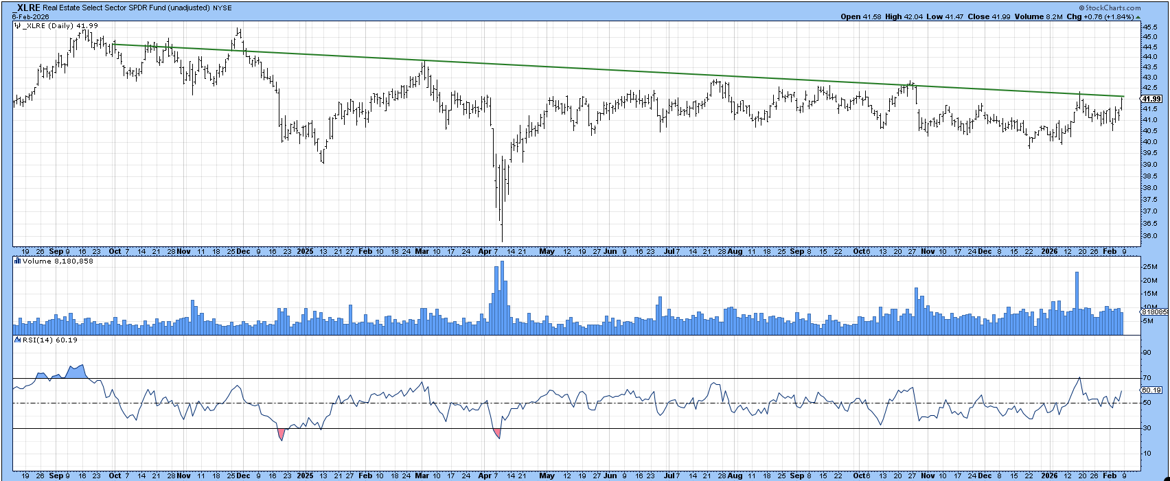 Notably absent was the tech-dominated NASDAQ Composite and tech itself in the form of the XLK. Another sector that did not register a new high, but could be close to doing so, is the high-yielding SPDR Real Estate ETF, the XLRE, so let’s take a closer look.