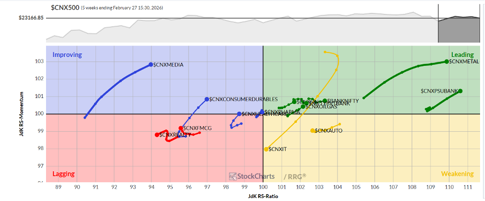 The Nifty Pharma Index has rolled back inside the improving quadrant. The Nifty Media Index is also inside the improving quadrant.