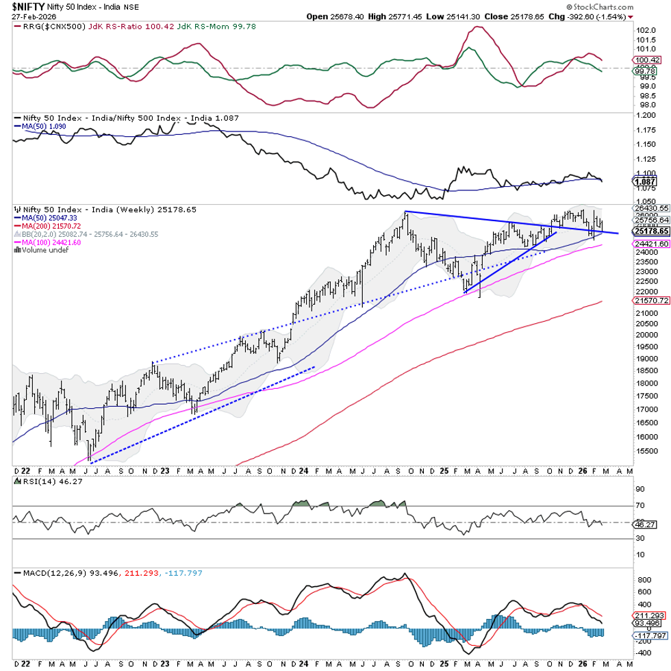 The markets traded under sustained pressure through the week and ended on a distinctly negative note. After attempting a modest recovery early on, the Nifty faced persistent selling at higher levels and drifted lower as the week progressed. The index oscillated within a defined range of 25,771.45 on the higher side and 25,141.30 on the lower side. Volatility cooled off , with the India VIX declining 4.60% to 13.70 on a weekly basis. The Nifty closed the week with a net loss of 392.60 points (-1.54%).