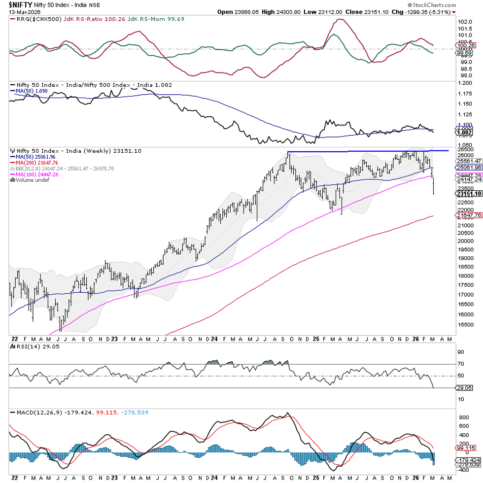 The markets witnessed a sharp and persistent decline through the week, ending decisively in the negative. After attempting to stabilize early in the week, the Nifty faced sustained selling pressure that intensified toward the latter half of the period. The index traded in a wide range of 1,191.80 points, oscillating between 24,303.80 and 23,112.00. Volatility remained elevated; India VIX surged another 13.91% during the week after rising nearly 45% in the previous week, reflecting heightened risk perception amid escalating geopolitical tensions. By the end of the week, the Nifty registered a net loss of 1,299.35 points (-5.31%).
