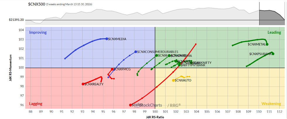 The Nifty Media Index is the only one inside the improving quadrant. It is rotating strongly, indicating a continued improvement in its relative momentum against the broader Nifty 500 Index.